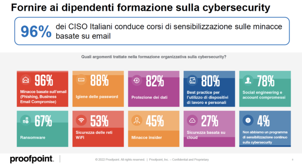 Le iniziative di formazione sono in grande crescita: il 96% degli intervistati conduce corsi di sensibilizzazione sulle minacce basate su e-mail; l’88% su una corretta igiene delle password; l’82% su come proteggere i dati; l’80% su come utilizzare al meglio device aziendali e personali.